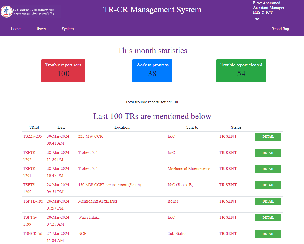 বিদ্যুৎ কেন্দ্র পরিচালনার সময় বিভিন্ন বৈদ্যুতিক, যান্ত্রিক, পুর, কারখানা ইত্যাদি সম্পর্কিত সমস্যা দেখা দেয়। সেসব সমস্যা সংশ্লিষ্ট সংরক্ষণ দপ্তরকে জানানোর জন্য কাগজের ফরম ব্যবহার করা হত। ট্রাবল রিপোর্টের পাশাপাশি Work Request, Clearance Report for Work, Clearance After Work, Closing Report সমূহও ধাপে ধাপে কাগজের ফরমের মাধ্যমে ম্যানুয়ালি পাঠানো হত। ম্যানুয়ালি ফরম পাঠানো ও সংরক্ষণ দপ্তরকে জানাতে দীর্ঘ সময় লাগায় সংরক্ষণ কাজ শুরু করতেও দীর্ঘ সময় লাগত যার ফলে প্ল্যান্টের এভেইলেবিলিটি ফ্যাক্টর হ্রাস পেত। উদ্ভাবনী ধারণার অংশ হিসাবে কাগজের ফরম ম্যানুয়ালি পাঠানোর পরিবর্তে ই-মেইলে পাঠানোর উদ্যোগ নেওয়া হয়। ফলে স্বল্প সময়ের মধ্যেই সংরক্ষণ দপ্তর তথ্য পাওয়ার ত্রুটি দূরীকরণের জন্য যথাযত কাজ শুরু করতে পারে। পরবর্তীতে মাননীয় প্রতিমন্ত্রী মহোদয়ের নির্দেশ মোতাবেক উদ্ভাবনী ধারণাটির স্কেল-আপের অংশ হিসাবে TRCR Management System সফটওয়্যারটি নিজস্ব জনবল দ্বারা প্রস্তুত করা হয়। এই সিস্টেমের ফলে বিদ্যুৎ কেন্দ্রের যে কোন সংরক্ষণ কাজ দ্রুত সময়ের মাঝে সমাধান করা সম্ভব হচ্ছে। পাশাপাশি এপিএসসিএল-এর ব্যবস্থাপনা কর্তৃপক্ষও খুব সহজেই প্রত্যেক ট্রাবল রিপোর্ট মনিটর করতে পারছেন।